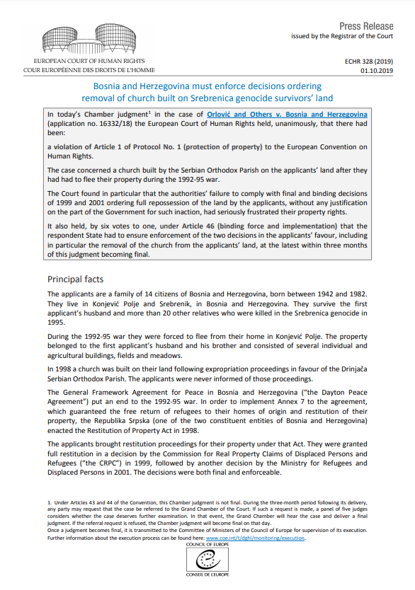U presudi se navodi da je Sud utvrdio propust vlasti da ispoštuju konačne i obavezujuće odluke iz 1999. i 2001. godine, kojima je utvrđeno pravo na povrat predmetne imovine u posjed podnositelja tužbe, kao i da tužena država treba osigurati uklanjanje crkve sa imovine Fate Orlović najkasnije u roku od tri mjeseca nakon što ova presuda postane konačna.