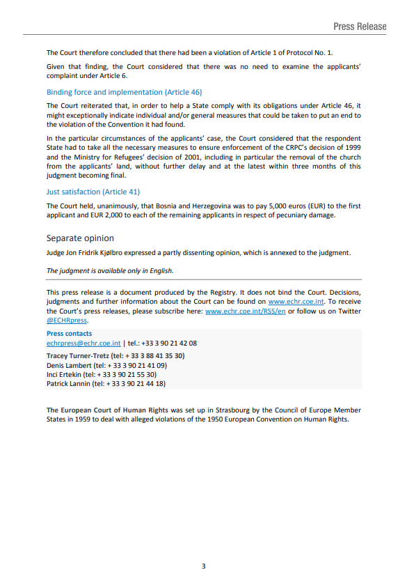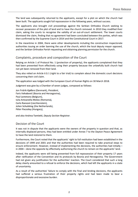 Sud je utvrdio propust bh. vlasti, odnosno da nisu poštovale konačne i obavezujuće odluke iz 1999. i 2001. godine, kojima je naloženo potpuno vraćanje zemljišta u posjed podnositelja predstavke, a za koji Vlada nije ponudila opravdanje, čime je ozbiljno narušila imovinska prava podnositelja predstavke. (…) Sud je također utvrdio, sa šest glasova naspram jednog, na osnovu člana 46. (obaveznost i izvršenje presuda) da tužena država treba da osigura izvršenje dviju odluka koje su donijete u korist podnositelja predstavke, a naročito da osigura uklanjanje crkve sa njihove imovine, najkasnije u roku od tri mjeseca nakon što ova presuda postane konačna.