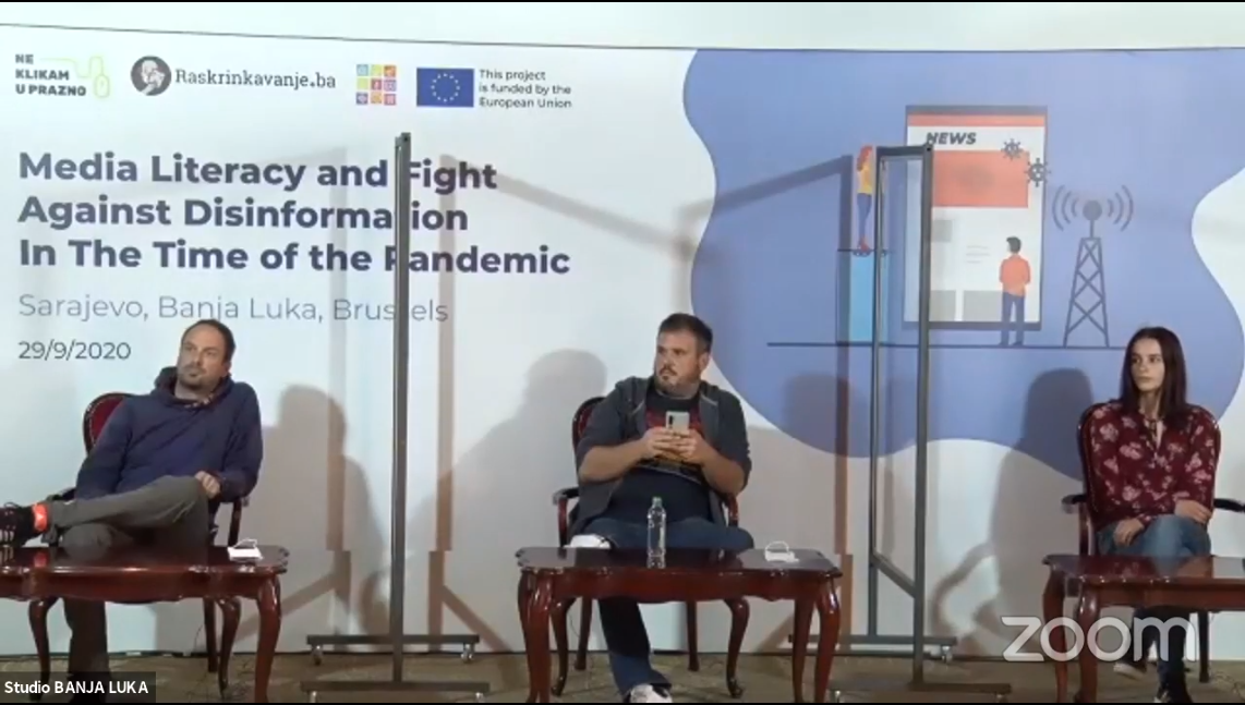 The conference was jointly organised by the Association “Why Not” (Zašto ne) on behalf of SEE Check network, Association of High School Students in BiH and the European Union, within the “Ne klikam u prazno” project funded by the EU with the aim of strengthening media literacy among youth. As part of the conference, three panel discussions were hosted from three cities (Brussels, Sarajevo and Banja Luka) on the subjects of media literacy, fact-checking and disinformation, with a focus on the pandemic in this sphere.