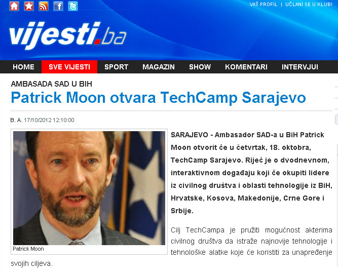 vijesti.baU.S. Ambassador to BiH Patrick Moon will open on Thursday, 18 October TechCamp Sarajevo. It is a two-day, interactive event that will bring together leaders from civil society and the field of technology from BiH, Croatian, Kosovo, Macedonia, Montenegro and Serbia.