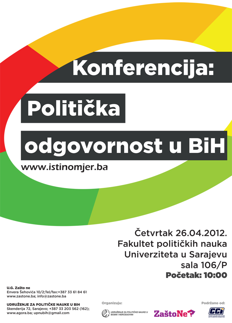 PlatakPolitička odgovornostU prostorijama Fakulteta političkih nauka Univerziteta u Sarajevu u četvrtak, 26.04.2012. godine, Udruženje građana  “Zašto ne” (tim  “Istinomjera”)  i  “Udruženje za političke nauke u BiH” organizovali su jednodnevnu konferenciju na temu “Politička odgovornost u BiH: teorijski i praktični pristupi”.