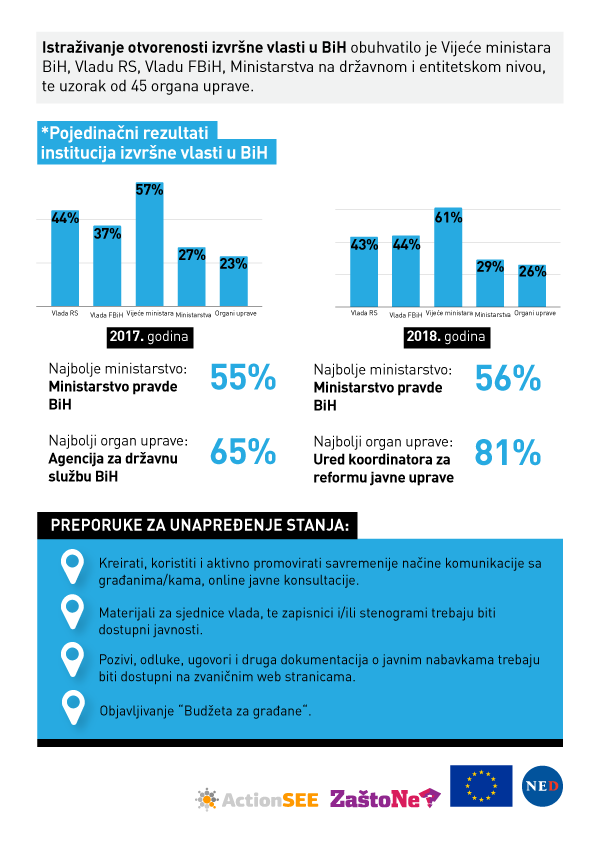 Treće po redu istraživanje koje je UG “Zašto ne” provelo zajedno sa članicama regionalne mreže ActionSEE, pokazuje da institucije izvršne vlasti u Bosni i Hercegovini u protekloj godini nisu unaprijedile način funkcionisanja koji bi rezultirao poboljšanjem otvorenosti, transparentnosti i odgovornosti prema građanima/kama.