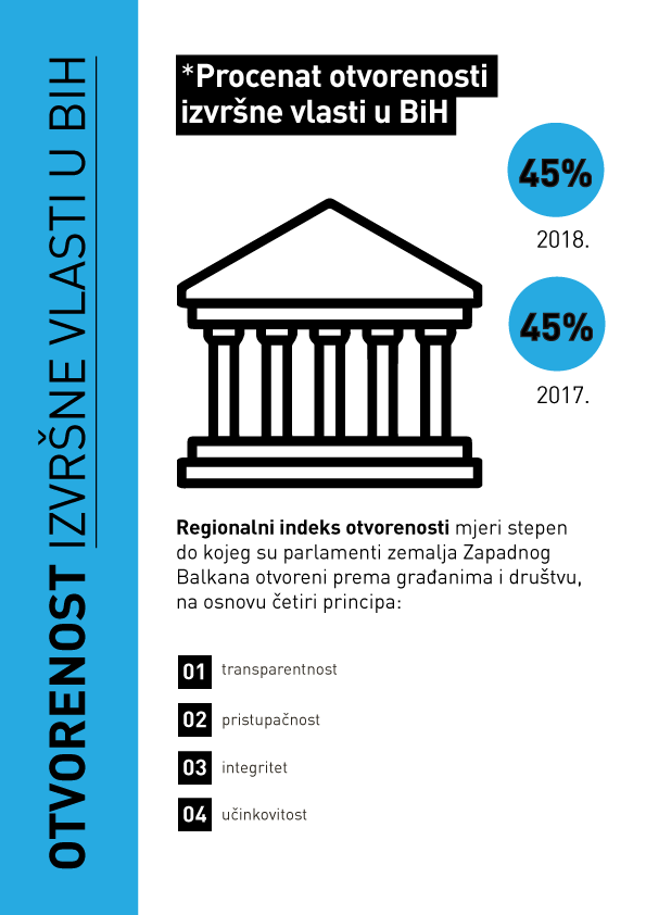Izvršna vlast (Vijeće Ministara, Vlada FBiH, Vlada RS) u BiH zadovoljava ukupno 45% indikatora otvorenosti. Najbolje rangirano je Vijeće ministara sa 61% zatim Vlada FBiH sa 44%, te Vlada RS sa 43% ispunjenih indikatora otvorenosti.