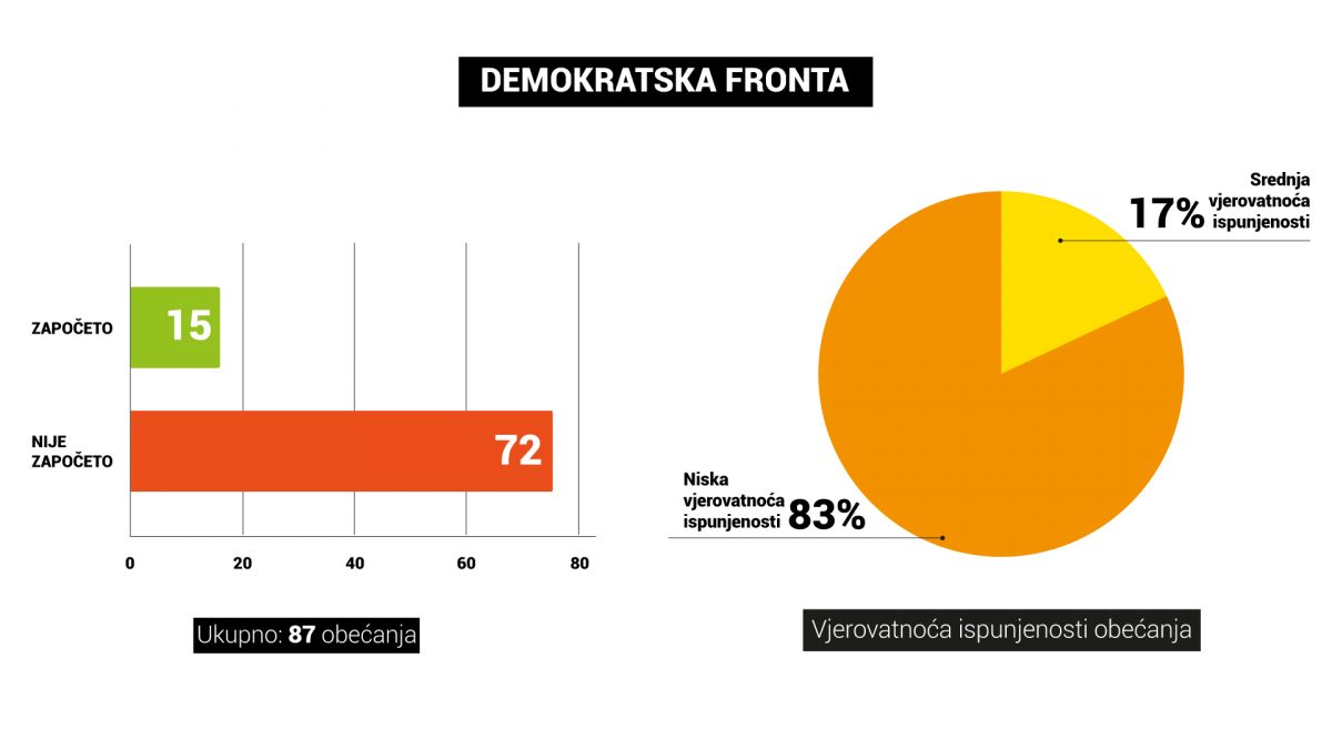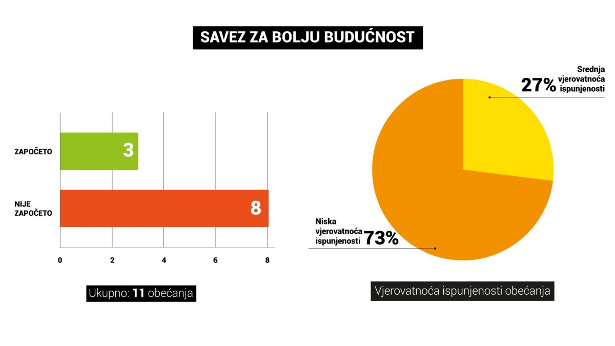 U oblasti ekonomije 11 obećanja ocijenjeno je kao započeto, a među njima su se našla obećanja o nastavku izgradnje koridora Vc, nastavaku procesa strukturnih prilagodbi i reformi u ekonomskom sistemu, povećanju državnog Budžeta, ulaganju u infrastrukturu, ali i druga. Međutim, veći dio obećanja u ovoj oblasti, njih 74 dobilo je ocjenu “nije započeto”, a neka od tih obećanja su uvođenje diferencirane stope PDV-a, formiranje fonda za razvoj mikro, malih i srednjih preduzeća, osiguranje pune ravnopravnosti stranih i domaćih investitora, donošenje zakona o koncesijama kao i Zakona o javnim dobrima, usvajanje Zakona o turizmu, ali i usvajanje brojnih strategija.