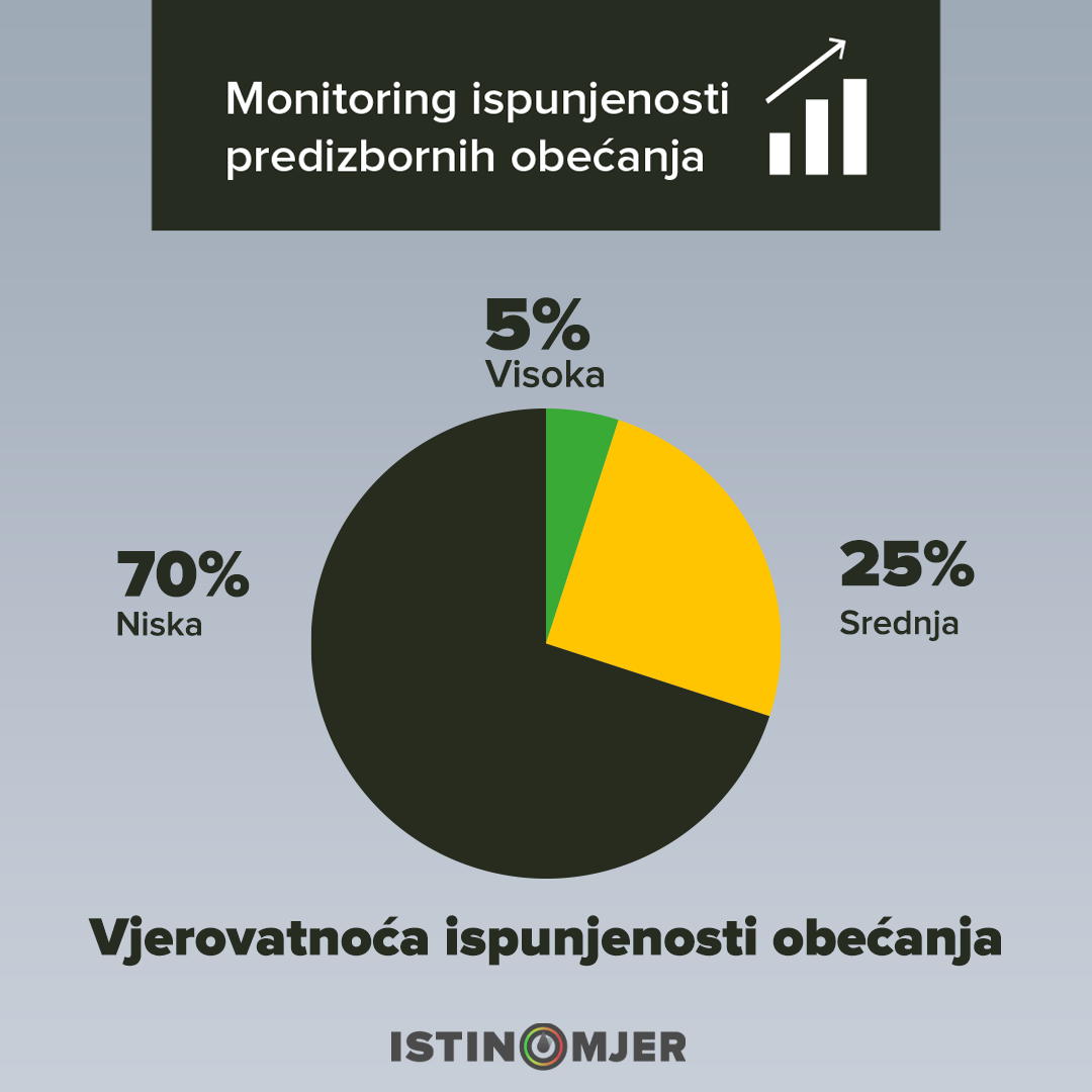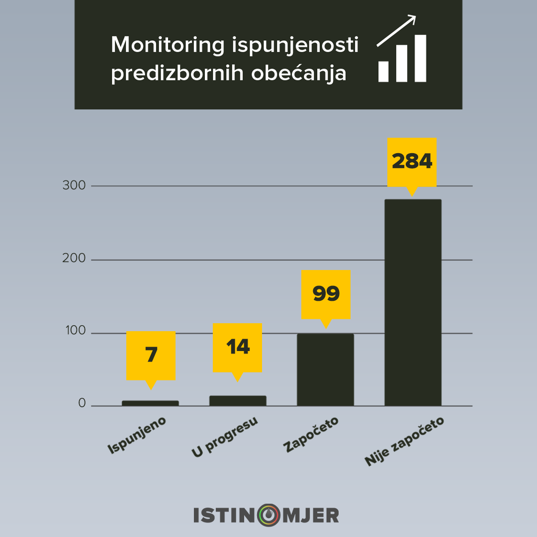 Rezultati monitoringa koji je Istinomjer provodio u periodu do 15. aprila pokazuju da je u progresu ispunjavanje 14 obećanja, dok su započete aktivnosti u pravcu ispunjavanja njih 99. Najviše obećanja dato je u oblasti ekonomije (146), dok ih je najmanje u oblasti zdravstva (33).
