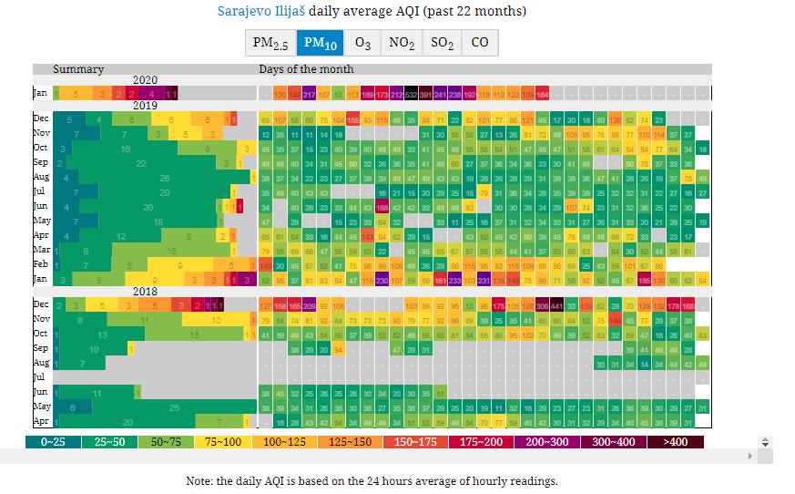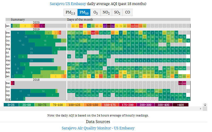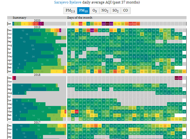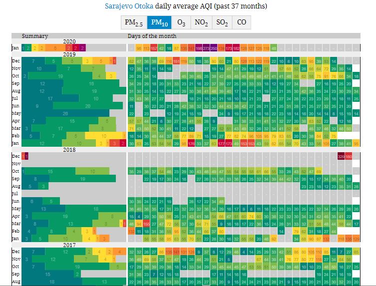 Podaci koji su objavljeni za sve mjerne stanice u Kantonu Sarajevo na međunarodnoj stranici za praćenje kvaliteta zraka aqicn.org također pokazuju da je problem prisustva PM10 čestica u zraku postojao i prethodnih godina, posebno tokom zimskih mjeseci, a to potvrđuju i podaci NVO Eko akcija.